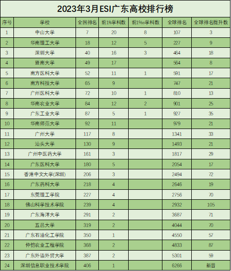 在本次2023年3月ESI高校排名中,内地高校共有409所进入全球前1%,其中共有24所广东高校进入全球前1%,中山大学、华南理工大学等进入“全国百强”高校,深圳信息职业技术学院新晋升为全球前1%高校,是新晋院校中唯一一所高职院校。中大、南方医科大学、华南农业大学等11所高校共新增13个全球前1%学科,全省24所高校共有21个学科入选前1‰、173个全球前1%学科,整体表现强劲。