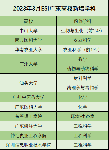 深圳信息职业技术学院首次入选,是此次唯一一所新增广东高校,其工程科学入选前1%。此外,还有广东海洋大学、仲恺农业工程学院的工程科学,东莞理工学院的环境/生态学,广东医科大学、广州中医药大学的化学,南方医科大学的农业科学,新增全球前1%学科。
