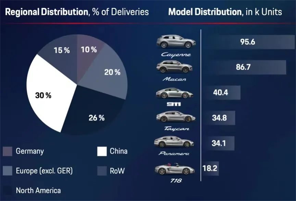 当然,销量的下滑不一定会必然带来营收的下降,中国市场的表现就能说明这点。2022年,保时捷在中国共交付了93,286辆新车,同比下滑2.5%。尽管中国市场是同期交付量唯一出现下滑的市场,但依然连续第8年蝉联了全球最大单一市场的宝座,贡献了近三分之一的销量,而销售收入则逆势增长了27%。