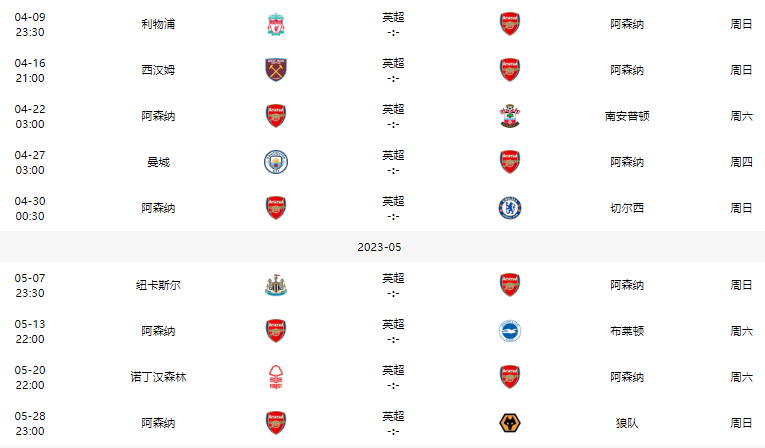 阿森纳接下来的对手:利物浦、西汉姆联、南安普顿、曼城、切尔西、纽卡斯尔、布莱顿、诺丁汉森林、狼队;