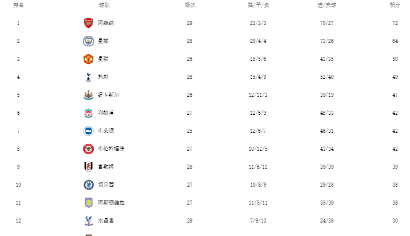 阿森纳目前的战绩是23胜3平3负,积72分,阿森纳虽然在国内杯赛和欧联杯中都早早出局,但是在联赛层面表现强势,他们在最近7场英超比赛中全部拿下胜利,上一次输球还是在对阵曼城的比赛。其他的赛事过早出局,对于志在冲击英超冠军,但板凳厚度并不足的阿森纳来说是非常明智的,他们本赛季的最大目标,就是拿下英超冠军奖杯。