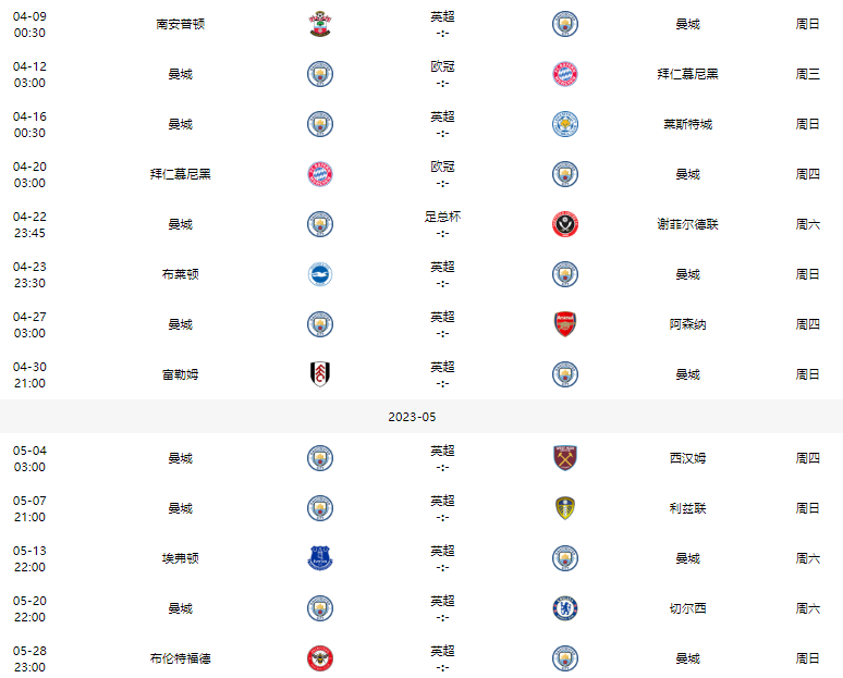 曼城接下来的对手:南安普顿、莱斯特城、布莱顿、阿森纳、富勒姆、西汉姆、利兹联、埃弗顿、切尔西、布伦特福德;
