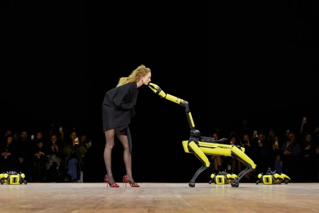 巴黎品牌Coperni连续两季分别用喷涂面料和机械狗作为秀场发布的噱头,其展现的科技含量让人眼前一亮,吸引了不少关注度。前者由Bella Hadid裸身上台接受材料喷涂;后者则在T台上利用了机械与模特之间的互动,展现了微妙的人机关系。不过当把两场秀合二为一的时候,不难会让人联想到Alexander McQueen当年那场经典的“NO 13”大秀。