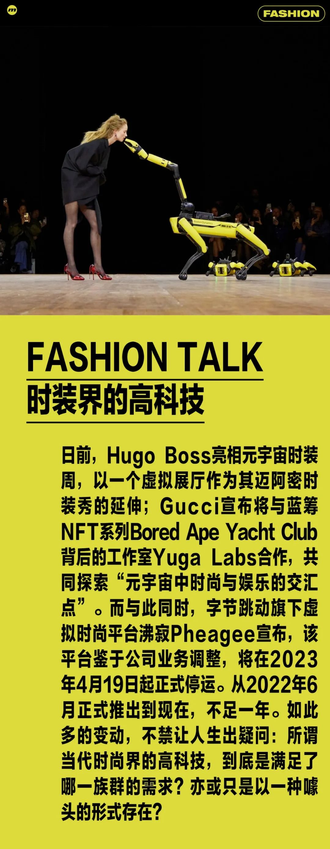 如今,一边是时装周上的线下时装秀,一边是线上数字原住民们在自己的世界里享受与世隔绝的生活,现实与虚拟还存在着巨大沟壑。对于高科技的运用,时尚界或许更需要做的是,如何通过科技手段对时尚行业进行升级的同时,让更多的消费者真正感受到时代的红利——就像2000年前后亚马逊和谷歌横空出世那样。