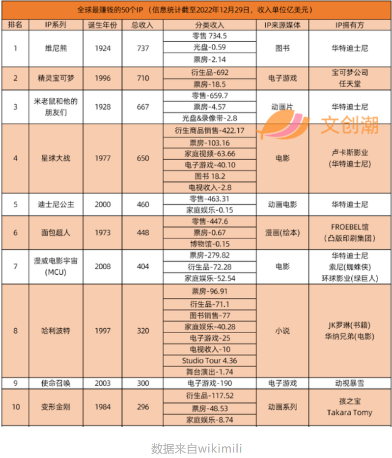 据统计,“面包超人”IP总收入448亿美元位列第六,其中衍生品零售收入447.6亿美元,几乎构成该IP全部收入来源。