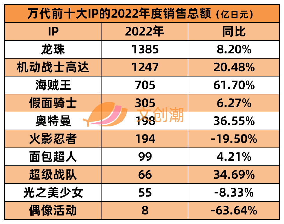 有数据显示,面包超人IP关联商品早在2010年就已达1.1万亿日元。2022年,仅万代一家的面包超人IP销售额为99亿日元,同比增长4.21%。