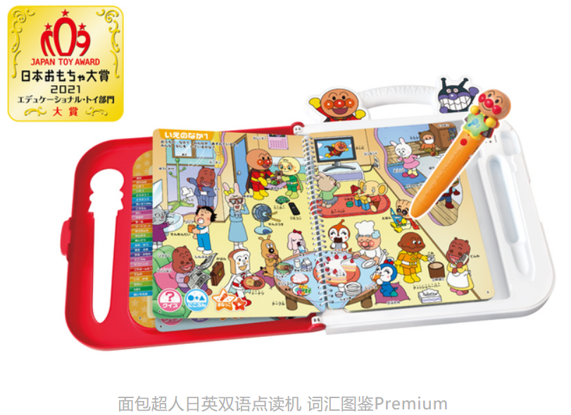 2021、2022年日本玩具热销综合榜TOP10中均有2款面包超人商品,分别是“面包超人日英双语点读机 词汇图鉴Premium”和“面包超人智育pad”,前一款也是“日本玩具大奖2021”益智教育玩具部门大奖得主。