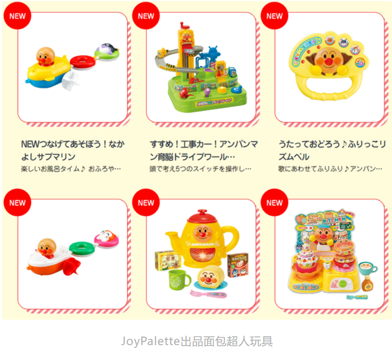 比如2022日本玩具大奖,基础玩具部门优秀奖得主是“面包超人大型烧烤套装”和另两款产品,共游玩具部门大奖得主是“面包超人声光魔法拍拍鼓”,共游玩具部门优秀奖得主分别是“面包超人按压式充气机”“面包超人自助收银机DX”“发光转圈圈!面包超人卡拉OK机”“多彩奥赛罗棋(橙色/蓝色/黑色)”。