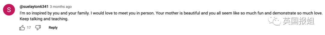 “我很受你和家人的启发,想见见你本人。你妈妈很美丽,一家人看着都很有趣,非常有爱。继续发声和科普吧!”