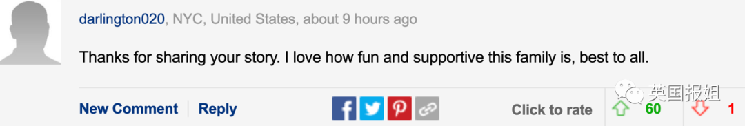 “谢谢你分享的故事,好喜欢这家人有趣又支持彼此的样子,祝好运!”