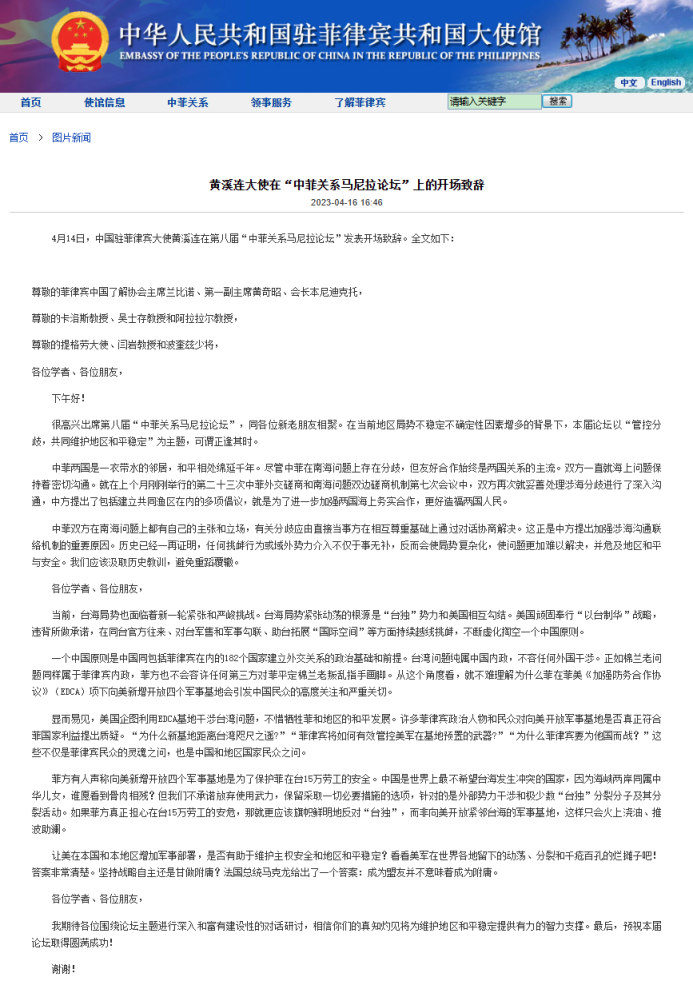 中国驻菲律宾大使黄溪连日前在第八届“中菲关系马尼拉论坛”发表开场致辞,本届论坛以“管控分歧,共同维护地区和平稳定”为主题。全文摘编如下: