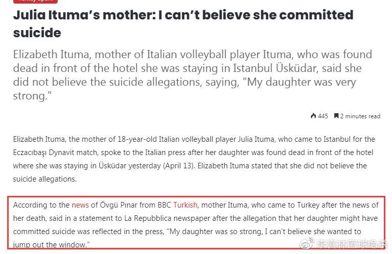 北京时间4月18日,意大利女排18岁天才接应朱莉娅·伊图玛坠楼身亡调查有了最新进展。伊图玛的母亲伊丽莎白和姨妈海伦都到了土耳其,其中母亲伊丽莎白在接受采访时表态,不相信女儿是自杀。