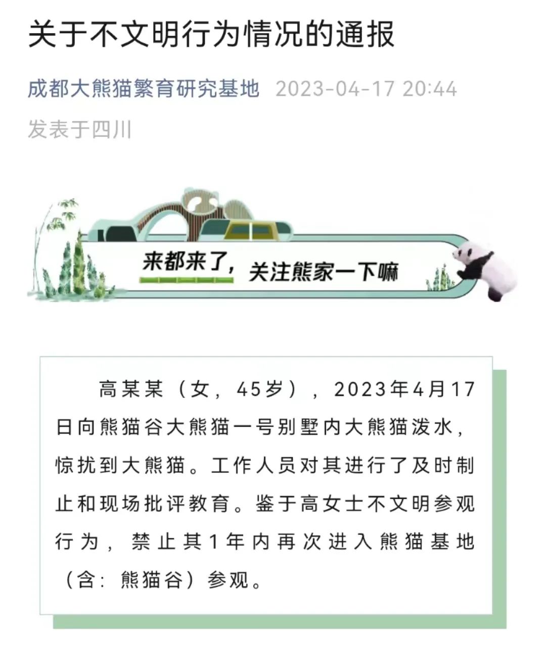 4月17日晚,成都大熊猫繁育研究基地发布关于不文明行为情况的通报。