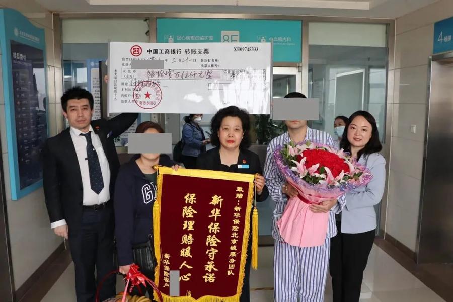 2023年4月上旬,新华保险北京分公司海淀联合营业区资深总监金丽丽、第三督导部负责人张维、红日部高级行销专务马玉华赶赴医院,将新华保险61.5万元重大疾病保险理赔金,送到突患严重冠心病的客户H先生手中。刚刚做完心脏支架手术的他满含热泪,手捧感恩锦旗,感谢新华保险雪中送炭奉献保险大爱。