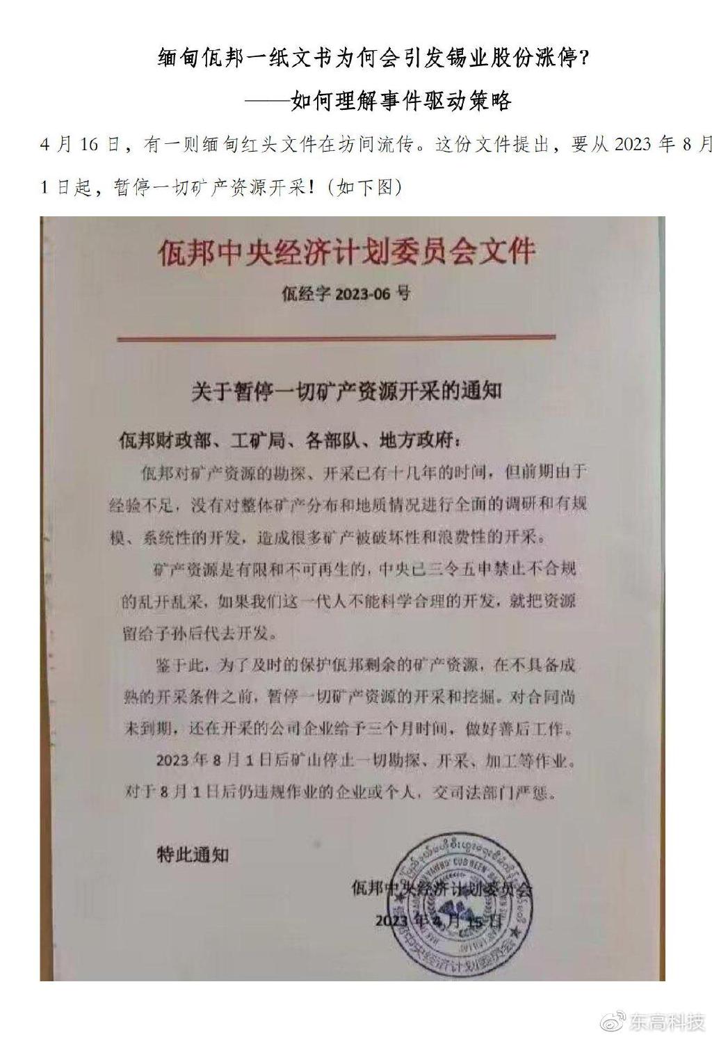 缅甸佤邦禁矿刺激锡价飙升。当地时间4月15日,缅甸佤邦中央经济计划委员会发布暂停一切矿产资源开采的通知,为保护佤邦剩余的矿产资源。2023年8月1日后矿山停止一切勘探、开采、加工等作业。缅甸是我国锡矿进口第一来源国,占国内锡矿进口总量的70%以上。而佤邦则是缅甸锡矿最大的产区,其大部分产量发往中国,禁矿无疑将使得本就趋紧的锡矿供应更加紧张。