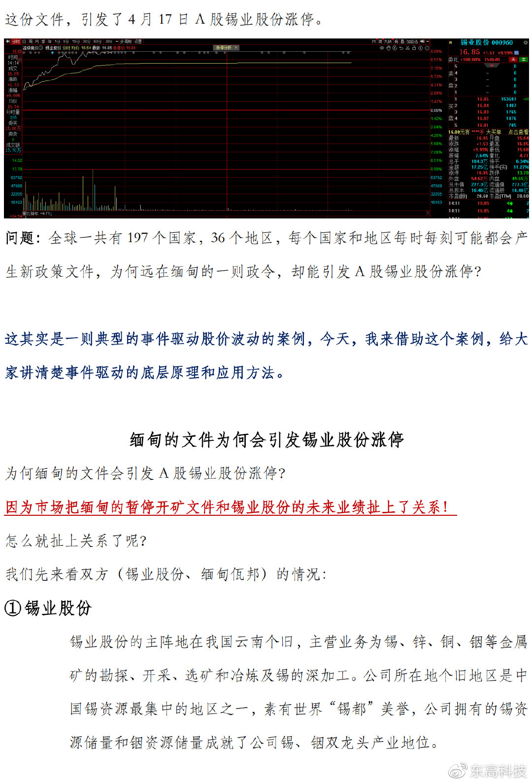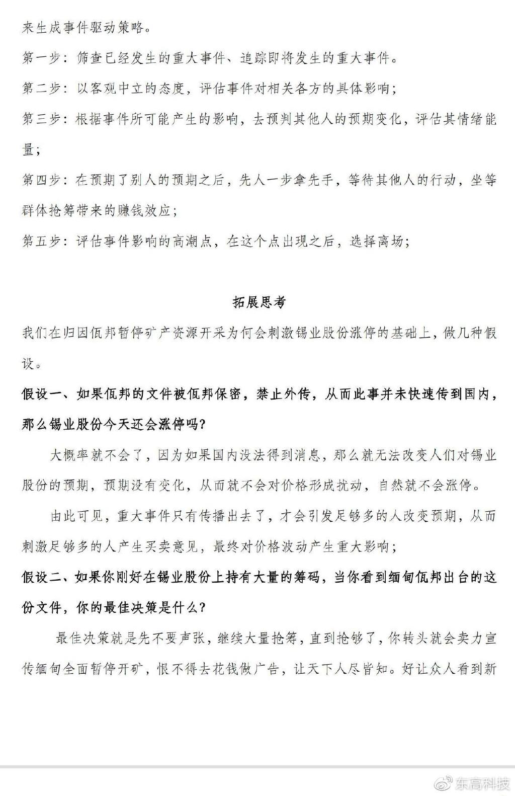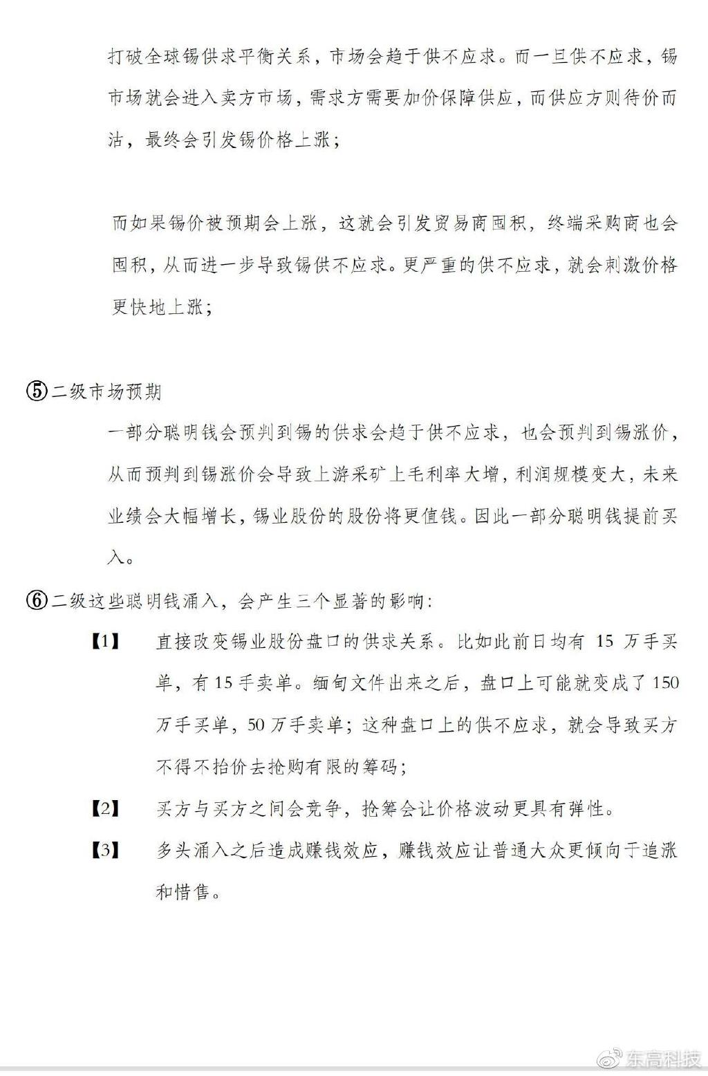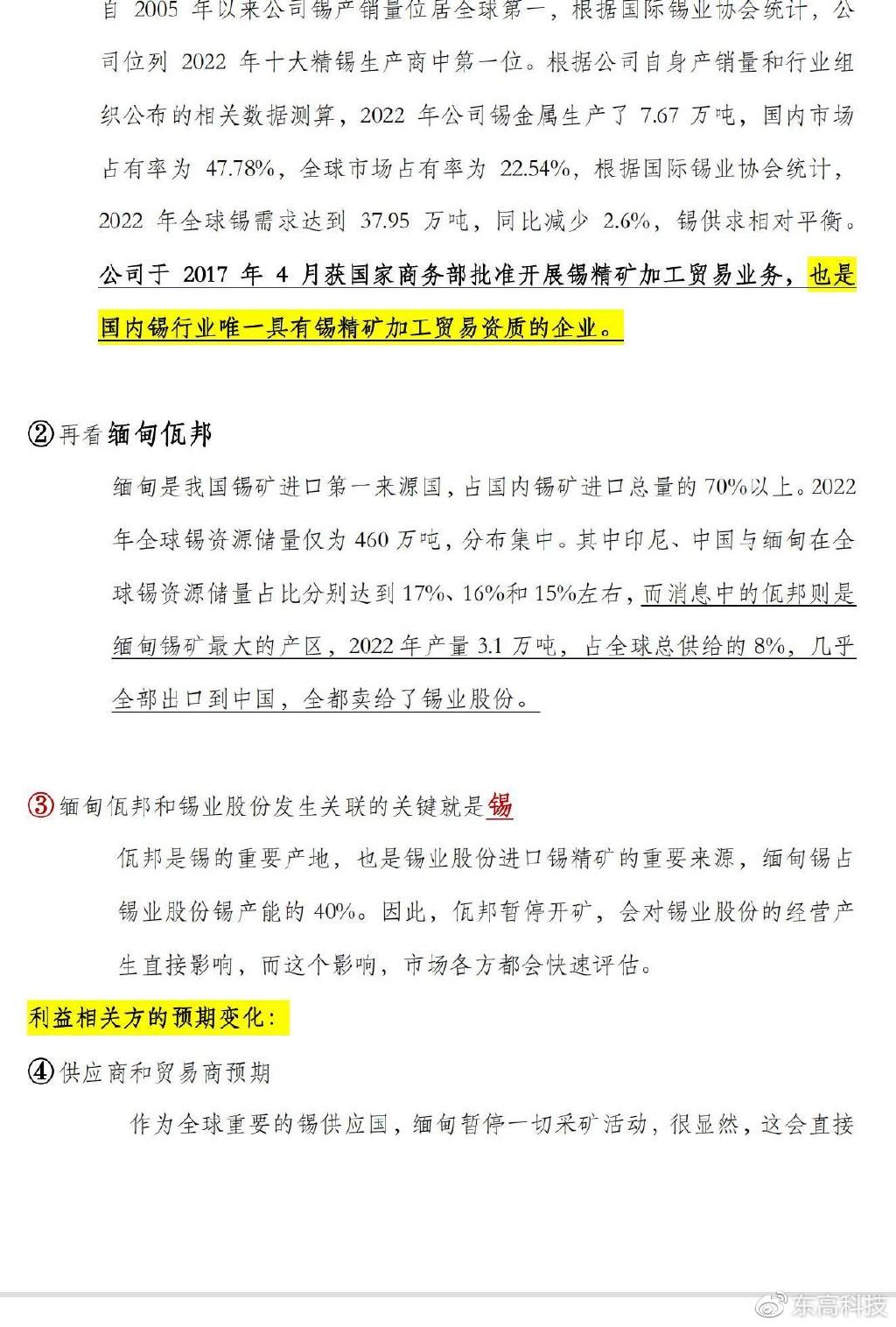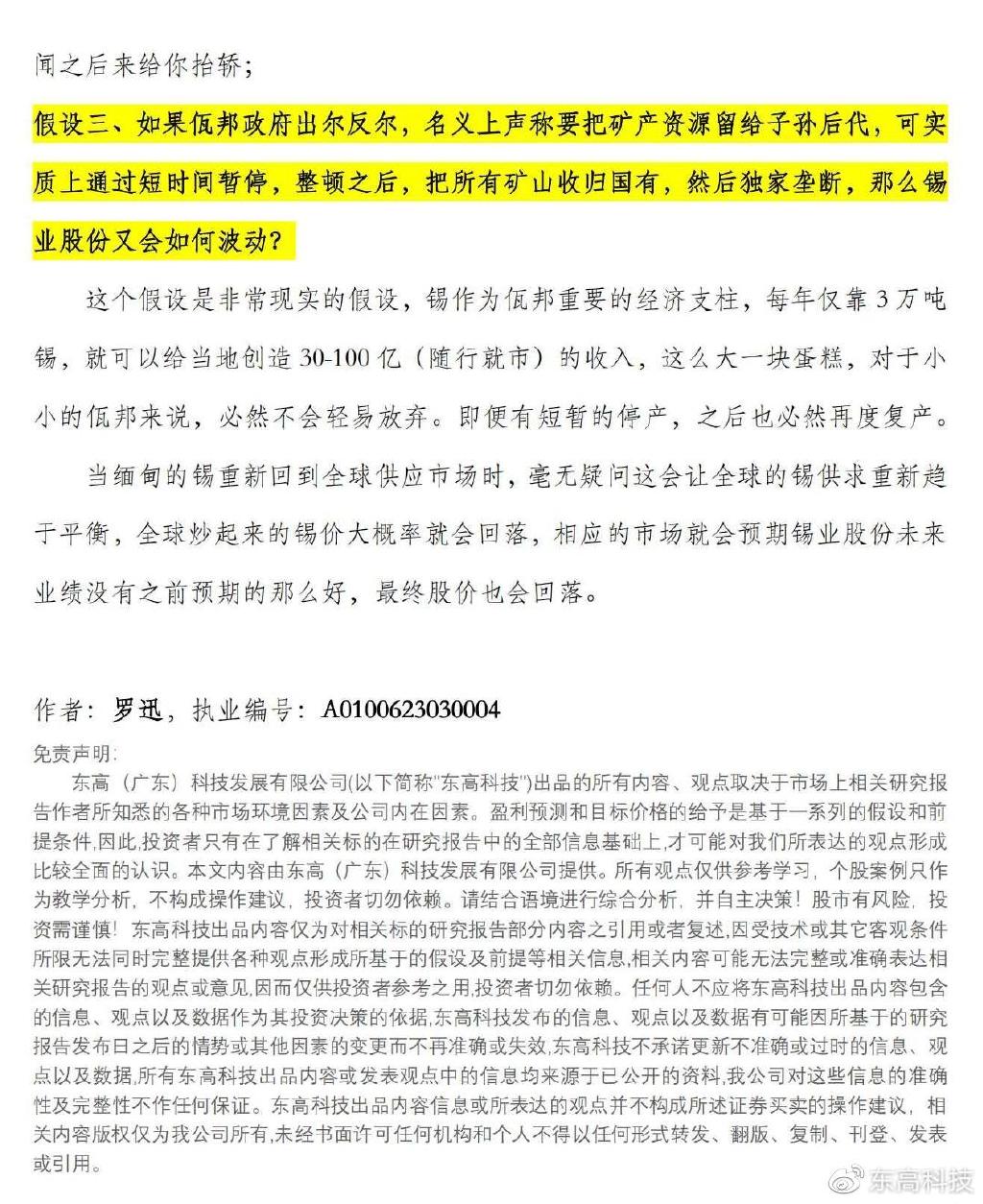 东高科技投资顾问罗迅(执业编号:A0100623030004)在归因佤邦暂停矿产资源开采为何会刺激锡业股份涨停的基础上,做出几种合理假设,为投资者梳理变局背后的来龙去脉,厘清利益天平的去向,让您“图”个明白,做出最佳投资决策!