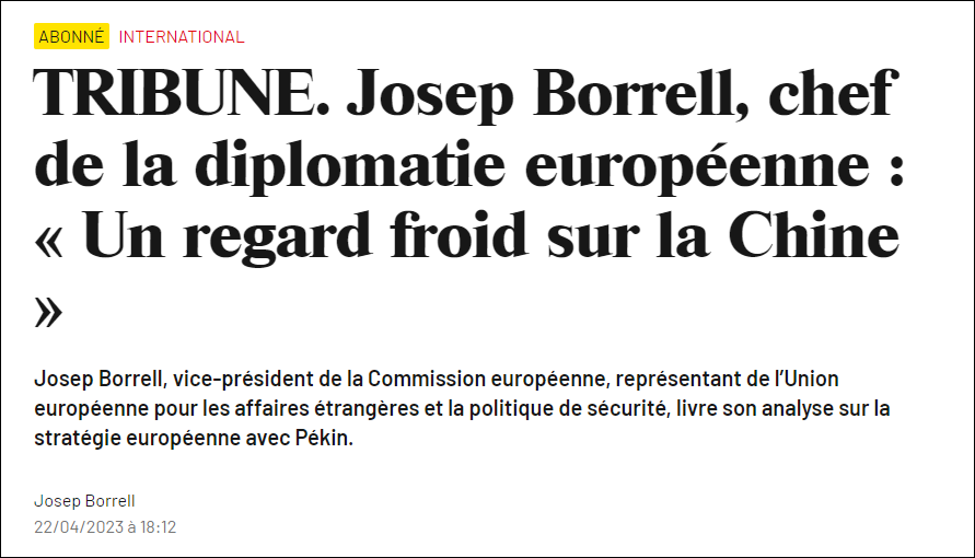 当地时间4月22日,欧盟外交与安全政策高级代表博雷利在法国《星期天报》(Journal Du Dimanche)就中欧关系发表评论文章,叫嚣“欧洲海军巡航台海”以维护所谓的航行自由,他近期也曾多次发表涉台言论。博雷利原计划于4月13日至15日访华,后因新冠检测呈阳性推迟访问。