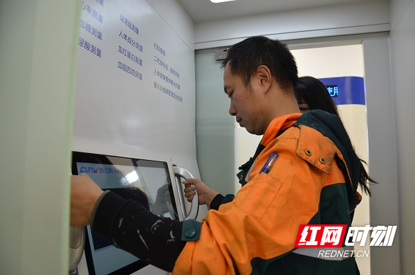 红网时刻新闻4月27日讯(记者 李海波 通讯员 黄微)4月25日,在长沙市岳麓区新云网智慧社区免费体验馆,多名清洁工、快递员等劳动者,在工作人员的引导下,依次进入“智慧健康亭”,进行免费体检。