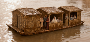 后来,诺亚后裔受到木头房子的启发,发明出了捕鱼舫在罗布泊捕鱼,这种捕鱼舫现在雅称为画舫: