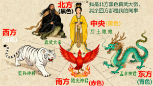 我是北方的玄武神真武大帝,对应黑色例如墨玉;南方的朱雀神陵光神君,对应赤色例如糖玉;东方的青龙神孟章神君,对应青色例如青玉;西方的白虎神监兵神君,对应白色例如白玉;中央的土神后土娘娘,对应黄色例如黄玉。我们五位神祇情谊深厚,一同镇守天地五方。