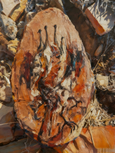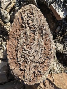 硬的部分抗风化能力强,保留下来;软的部分被逐渐侵蚀,凹了下去。氧化铁的局部富集让颜色加深,形成“线条”与“色块”。最终,一幅天然的图案在岩石表面展开。