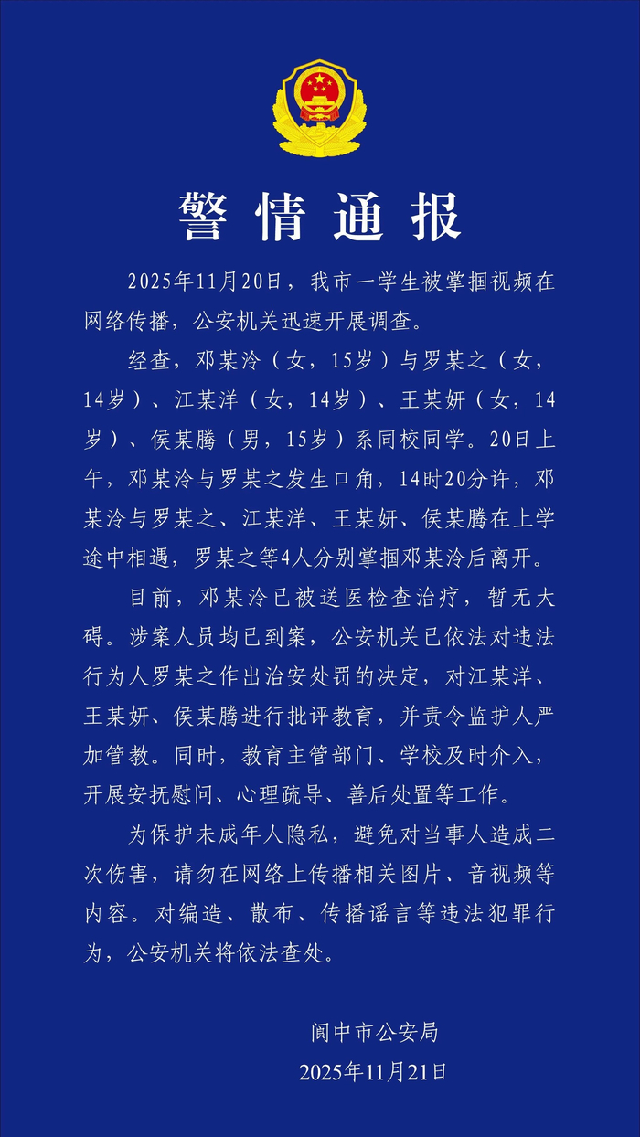 央视网消息:四川阆中市公安局11月21日发布警情通报:2025年11月20日,我市一学生被掌掴视频在网络传播,公安机关迅速开展调查。