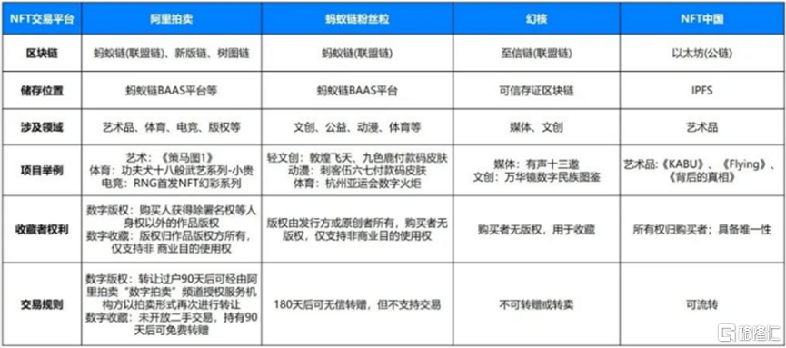 目前国内主流的NFT交易平台有:NFT中国、蚂蚁链粉丝粒、阿里拍卖和幻核。