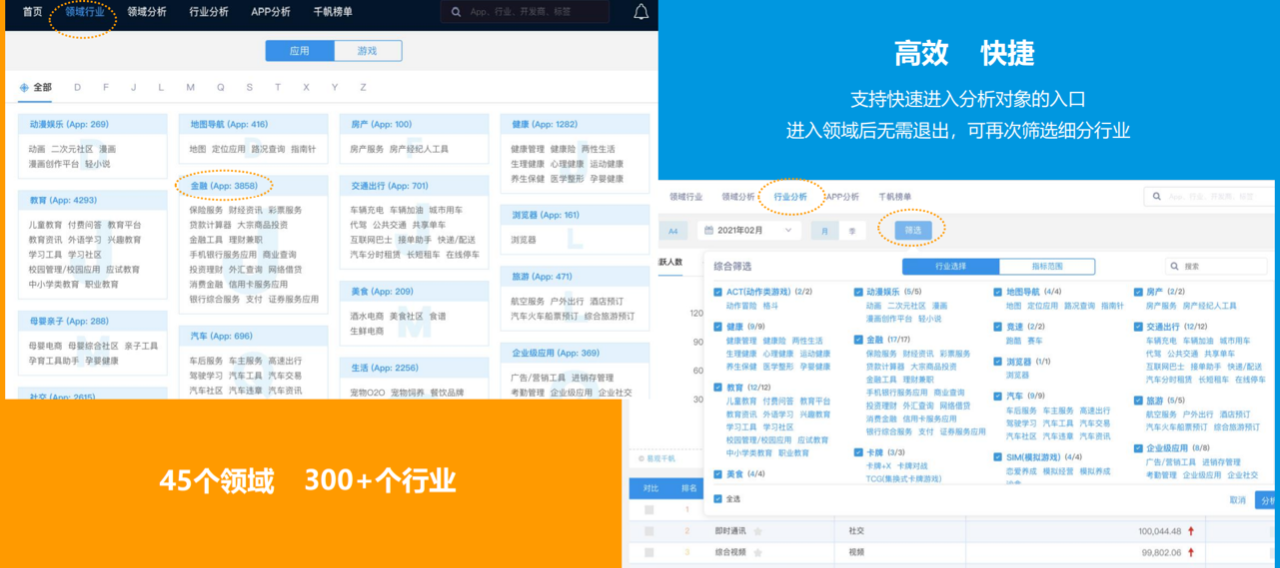 易观千帆是国内权威的数字经济洞察平台,基于数字用户在移动端的海量数据,建立客观、权威的移动应用评级,分析用户行为特征,建立数字消费者用户画像,为客户提供内部运营决策和外部竞争分析的一站式服务。产品覆盖24.5亿终端、6.7亿移动端月活用户,金融、汽车、零售等45个领域、超300个行业、5万余个APP数据指标。