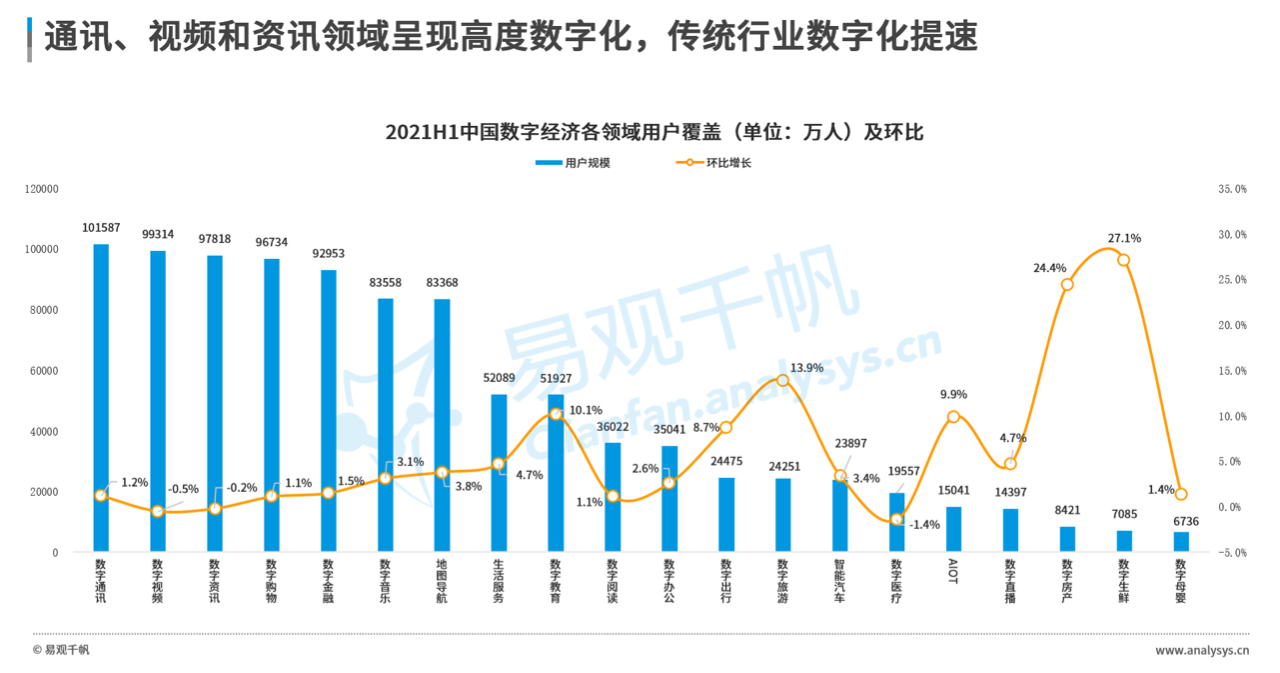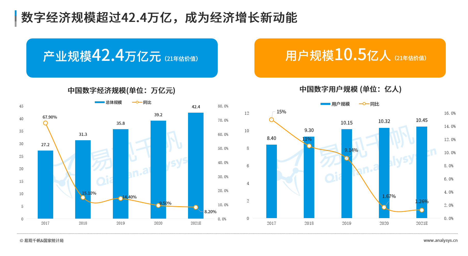 根据白皮书,2021年中国数字经济产业规模预计超过42.4万亿元,成为经济增长新动能;中国数字用户规模预计将达10.5亿人,整体依旧保持小幅增长态势。数字经济各细分领域用户覆盖数据显示,通讯、视频和资讯领域呈现高度数字化,传统行业数字化提速。