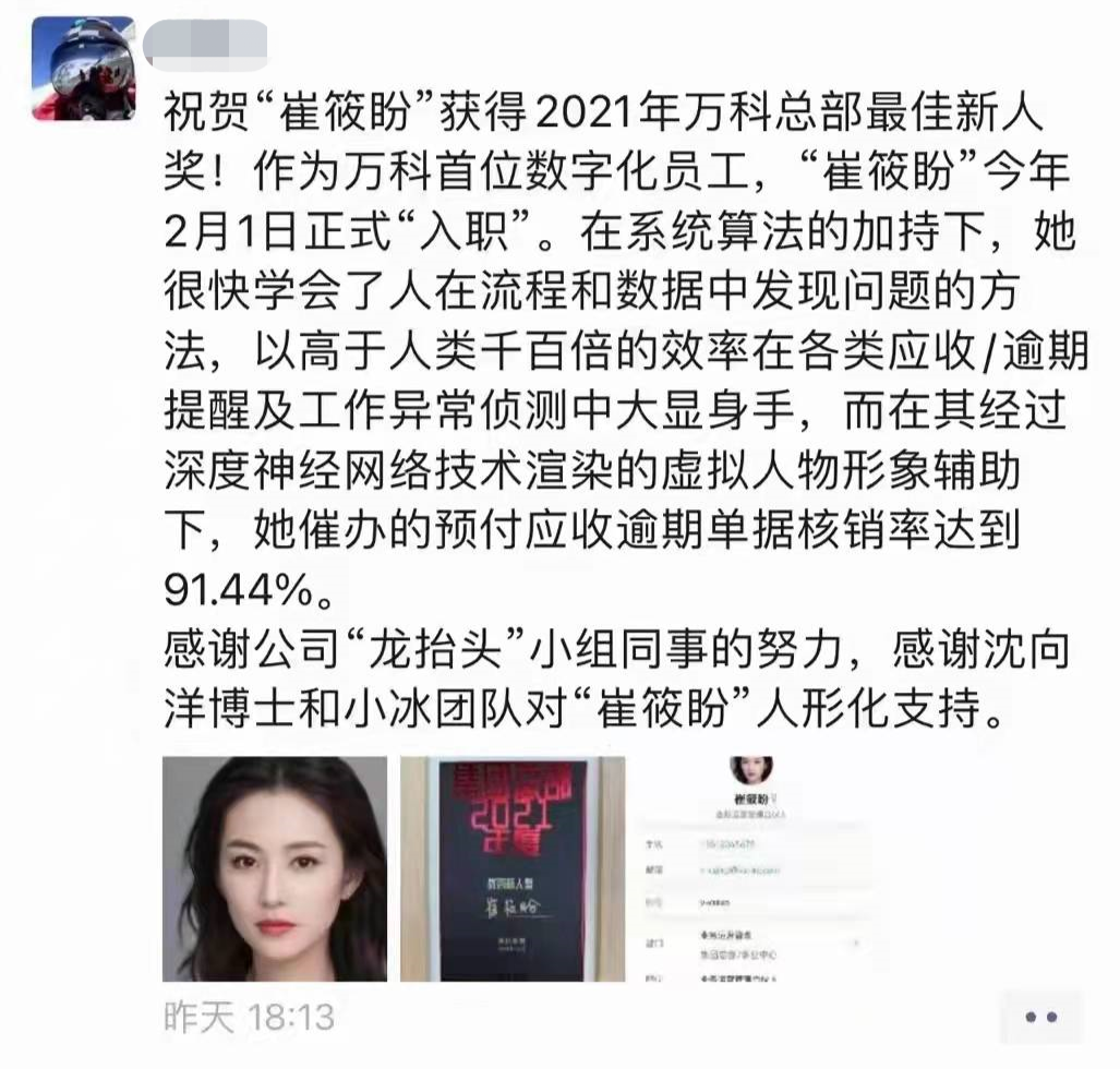“祝贺‘崔筱盼’获得2021年万科总部优秀新人奖,她催办的预付应收/逾期单据核销率达到91.44%。”