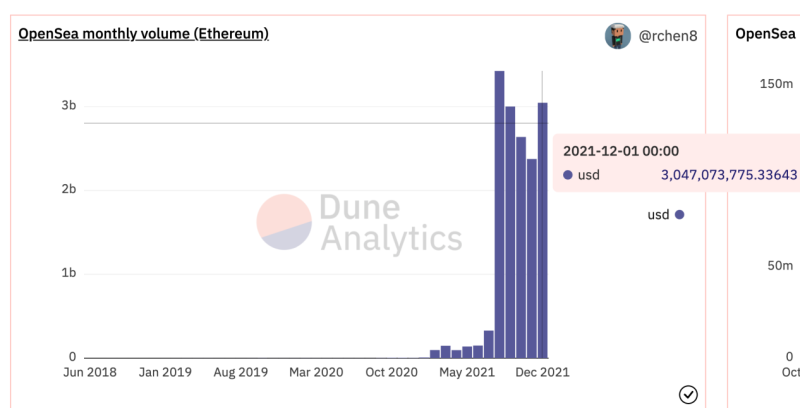 而以NFT交易平台来看,市场份额最大的OpenSea本月交易量突破30亿美元,活跃交易用户超过34.5万,创下历史新高。