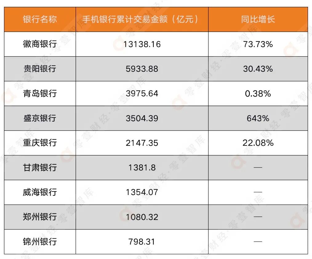 三、累计交易金额:徽商银行1.3万亿元领衔,盛京银行同比增长6倍多