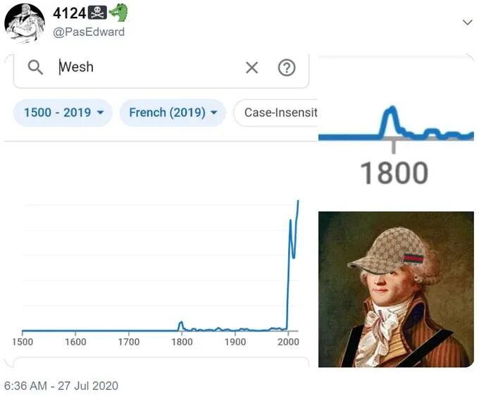 结果显示,趋势曲线在1800年的位置上出现了一次波折,意味着“Wesh”在1800年的著作中有使用记录。虽然不明白原委,PasEdward还是把自己的发现放到推特上分享,同时配上一张简陋的P图,为法国大革命时期的著名政治家罗伯斯庇尔戴上了一顶现代帽子。