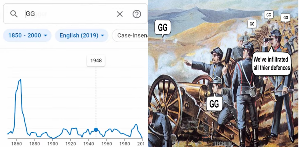 然而,更多的人把统计器用在了不那么学术的用途上。在以造梗与玩梗著称的互联网民中,流传着这么一种玩法:用词频统计器搜索一些21世纪才出现的流行语及特有名词,等待统计器提供一条令人细思恐极的曲线。