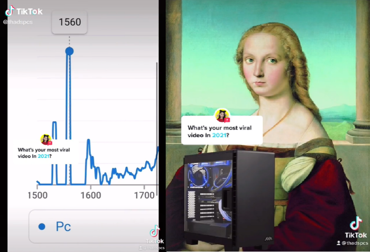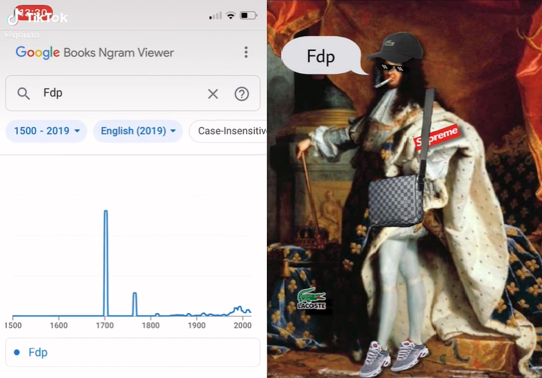 2021年10月10日,法国网友qouaa依照上面的格式制作了一部短视频,他搜索的词汇是“Fdp”,意思与英文中的“Son of Bitch”(婊子养的)接近。趋势曲线在1700年左右有所上涨,接下来的一幕中出现穿着潮牌说着脏话的路易十四,也显得顺理成章。