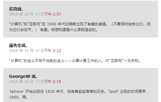 当然,任何科学测量工具都不可能做到百分百完美,数据与算法也不例外。能够在短短数秒之内完成定量分析,得出某种事物在数百年中的大致发展动向,正是谷歌图书词频统计器的价值所在。