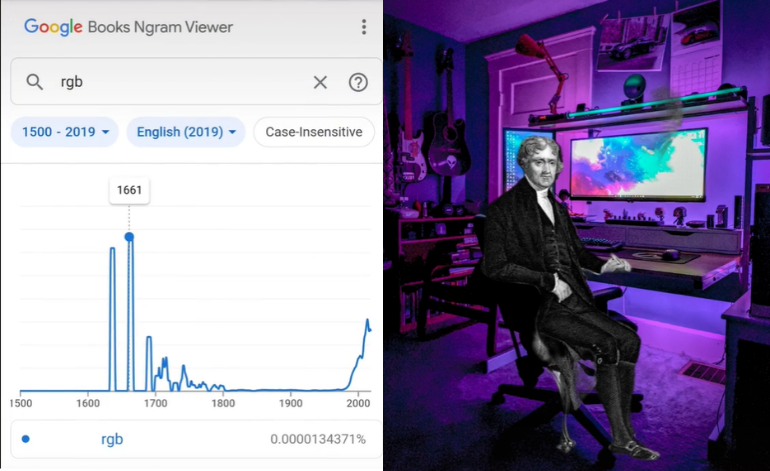 词频统计器告诉我们,16世纪有PC(个人电脑),17世纪有RGB(最常见的颜色系统),证明近代欧洲人已经在使用电脑,并且对电脑硬件上的彩光特效情有独钟。