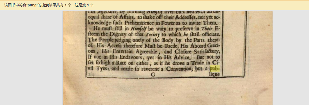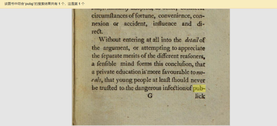 19世纪及以前的英文印刷品经常出现每行或每页末尾写不下完整单词的情况,印刷商会在没写完的单词后接上一根横杠“-”,让读者去下一行或下一页找到单词的后半部分。正是这个“-”,会被OCR识别成字母,像是“pub-”,就会出现在《绝地求生》缩写“pubg”的搜索结果中。