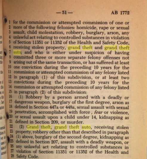 文章开头视频中的GTA,即“grand theft auto”,在美国对应一种盗窃机动车的罪名。在谷歌图书搜索“grand theft auto”,并把搜索时间限定至18世纪的话,我们会查到一部实际在1981年出版、文中多次提到GTA的美国加利福尼亚州议会法案,它的出版日期被谷歌错标成了“1771年”。