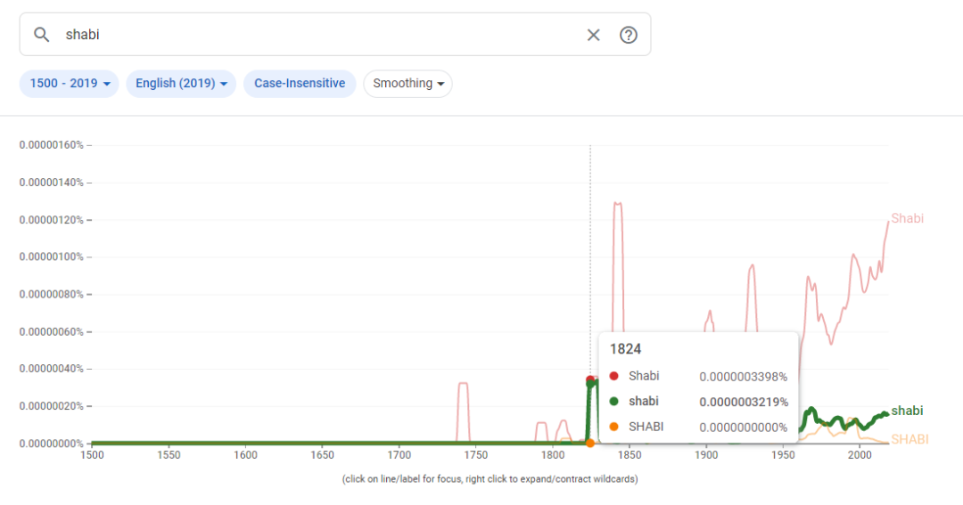在B站有人查到“shabi”一词最早在美国《独立宣言》颁布的1776年出现,这也不符合真实索引结果。至少在谷歌英语语料库,这个词的纯小写形式直到1824年才首次有人使用。