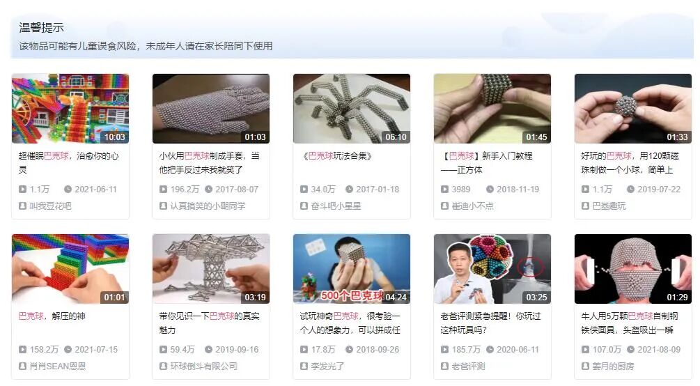 此前火爆一时的“巴克球”刚兴起时,就号称能够开发儿童智力,被卖给了远低于适用年龄的孩子使用。在被曝出多起严重事故后,才被整顿了一番。现在连视频网站上观看相关视频,都有着醒目的提醒,“可能有儿童误食风险”。