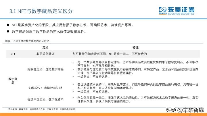 NFT是数字资产化的手段,其应用包括了数字艺术、可编程艺术、游戏资产等等。数字藏品强调了数字作品的艺术价值及收藏属性。