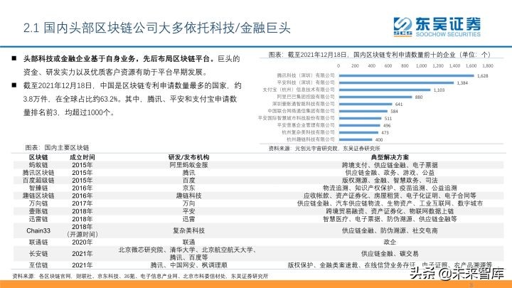 头部科技或金融企业基于自身业务,先后布局区块链平台。巨头的 资金、研发实力以及优质客户资源有助于平台早期发展。截至2021年12月18日,中国是区块链专利申请数量最多的国家,约 3.8万件,在全球占比约63.2%。其中,腾讯、平安和支付宝申请数 量排名前3,均超过1000个。(报告来源:未来智库)
