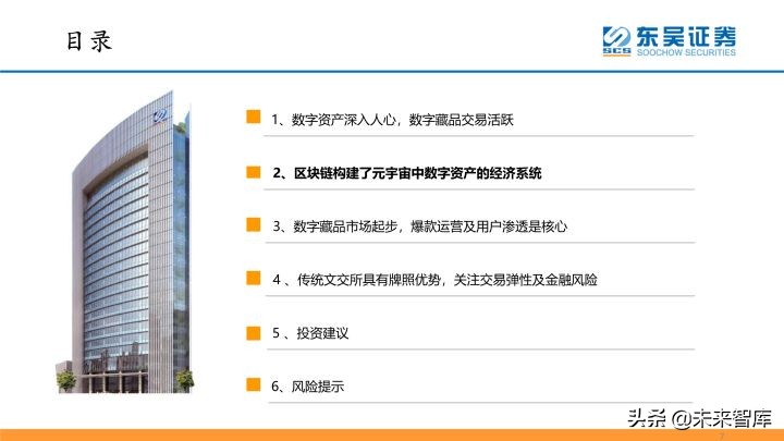 我们此前研究总结,元宇宙尚处于早期,其包括六个构成要素,分别为算力、算法、通信、人体交互技术、产权规则、应用场景等。Roblox在 美股的上市,以及英伟达在虚拟人方面的应用,使得二级市场投资人开始重视元宇宙的投资机会,尤其是基于区块链技术的数字资产确权及交 易。我们认为,基于区块链的数字资产是本轮元宇宙发展的重要催化。
