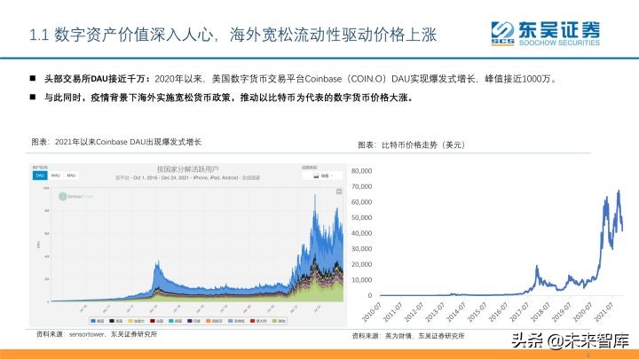 头部交易所DAU接近千万:2020年以来,美国数字货币交易平台Coinbase(COIN.O)DAU实现爆发式增长,峰值接近1000万。与此同时,疫情背景下海外实施宽松货币政策,推动以比特币为代表的数字货币价格大涨。