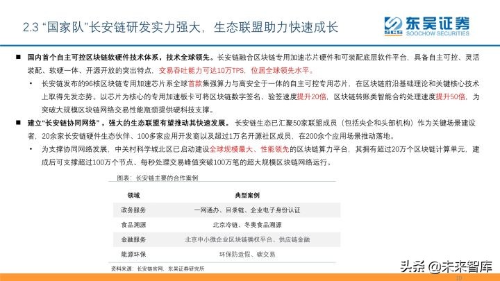 建立“长安链协同网络” ,强大的生态联盟有望推动其快速发展。 长安链生态已汇聚50家联盟成员(包括央企和头部机构)作为关键场景建设 者,20余家长安链硬件生态伙伴、100多家应用开发商以及超过1万名开源社区成员,在200余个应用场景推动落地。 为支撑协同网络发展,中关村科学城北区已启动建设全球规模最大、性能领先的区块链算力平台,其拥有超过20万个区块链计算单元,建 成后可支撑超过100万个节点、每秒处理交易峰值突破100万笔的超大规模区块链网络运行。
