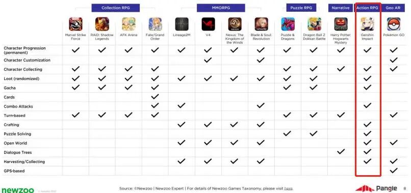 以《原神》为例,基于游戏开放世界、动作玩法等特点,Newzoo报告将其划入ARPG范畴。但这样的简单分类难免有些变扭,毕竟报告中也提到了《原神》的诸多丰富特性。既拥有MMO的多数特征,还具备更多功能和深度玩法,而这样的混搭型RPG通常很难被准确分类。更何况从具体系统来看,游戏显然更接近收集型RPG。