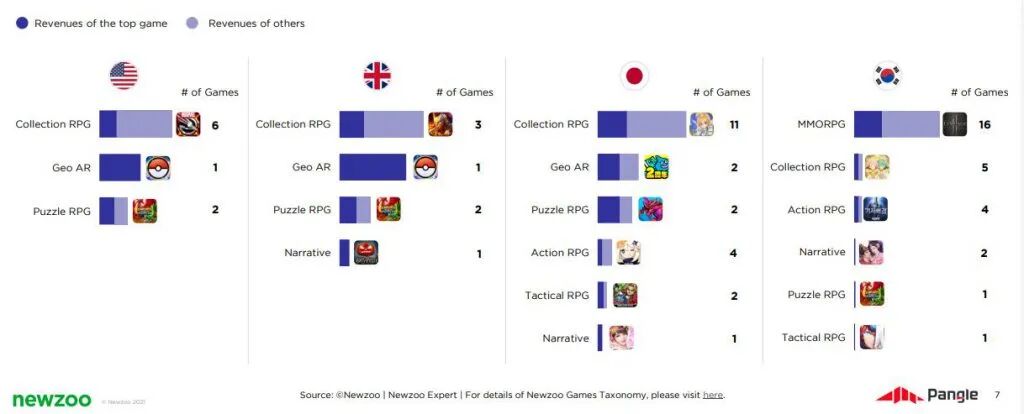该报告显示,2020年前三大RPG手游收入市场分别是中国、日本和韩国,分别为 78 亿美元、34.6 亿美元、20.4 亿美元,垄断全球70%以上的份额。其中,中日两大市场都是以收集型RPG为主。