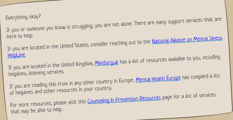 点击这个按钮,就会出现美国、英国及欧洲几个心理健康机构的网站链接(因为使用英语的网友最多),通过这些链接可以获得具体的心理求助方式。