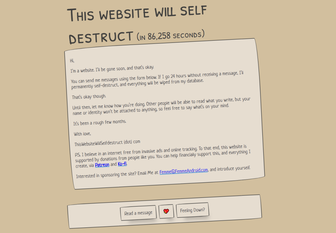 它的自毁可以被网友们拯救。在开发者写的简介中,你可以找到给这个网页续命的方式:“你可以向我发送信息。如果24小时我没有收到信息,我将会永久自毁,所有东西都将从我的数据库中删除。”